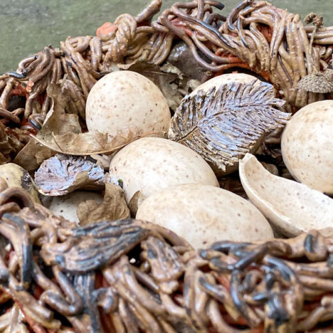Osterzeit und Osterhasen auch in der Kornbrennerei, wo künstlerisch ja so einiges ausgebrütet wird. Dieses Nest mit Eiern, Zweigen, Blättern, Eierschale … wirkt täuschend echt oder? Dabei ist es steinhart aus Keramik.…